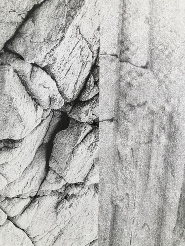 Fotografien auf Affichenpapier, plakatiert, vier Rahmen (50 x 70 cm) mit je einer gefundenen Fotografie, Textfragmenten von Lisa Krusche, Gesteinsfotografie auf Barytpapier, Godzillaspielzeug