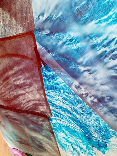 Bettzeug, Tischdecken, Handtücher, Stoffvarianten, mit Textfragmenten und Fotografien bedruckte Stoffe, Fotografien auf Planen, Tüll, Stofftiere, Wackelaugen, Untersetzer, Wäscheklammern, Trennwände aus dem Kirchenraum